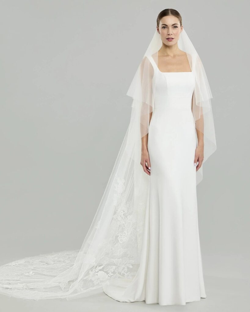 Corte: Velo de doble capa con caída en cascada y bordado central descendente.